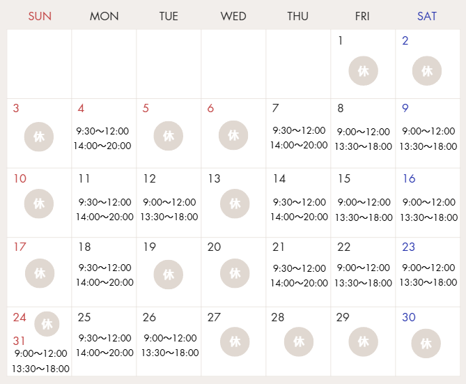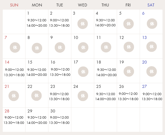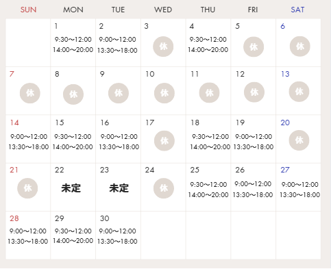 予約は2か月先の末日まで可能です。ご予約は、カレンダーの診療日の時間内・もしくは休診日でも月~土(日・祝・水除く)の9:30~17:00はお電話にてご予約・変更可能です。また、稀に急な出張などでご予約の変更をお願いさせていただく場合がございます。(メディカルエステの営業時間は10:00~18:00(日・祝・水除く)の固定です。)
